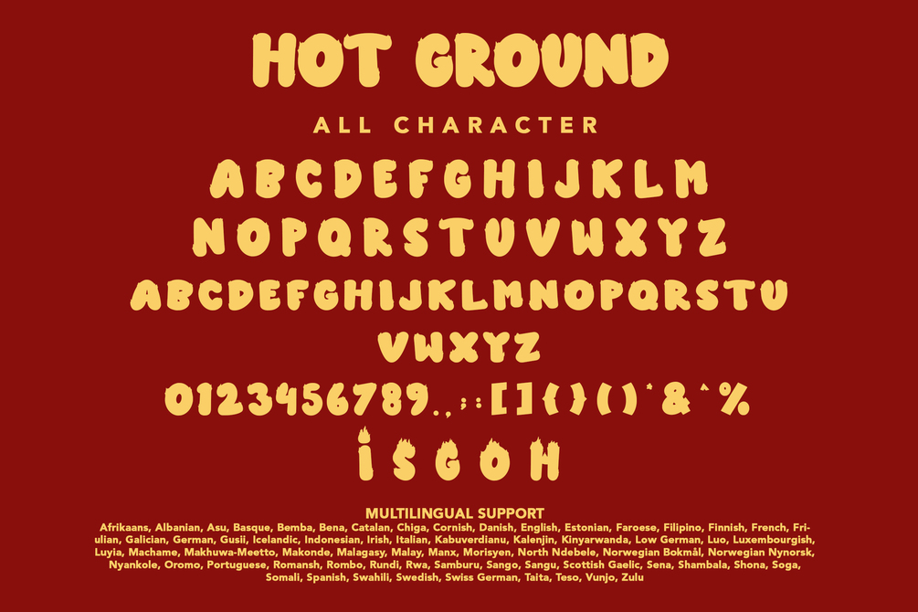 Hot Ground is a Comic Display Font. A typeface designed to showcase characters that are fun, expressive, and full of life, similar to the handwritten style often found in comics. With bold, linear, and often eccentric shapes, this font is designed to make a strong, clear impression when used in titles, typical comic text, or graphic designs with a comic feel. The power of this font lies in its ability to convey emotion, laughter, and visual dynamics through each letter. With bold, bold lines and characters depicting action scenes, the Hot Ground Comic Display Font creates an entertaining and iconic atmosphere, making it suitable for creative projects that want to convey a comic touch in their design.